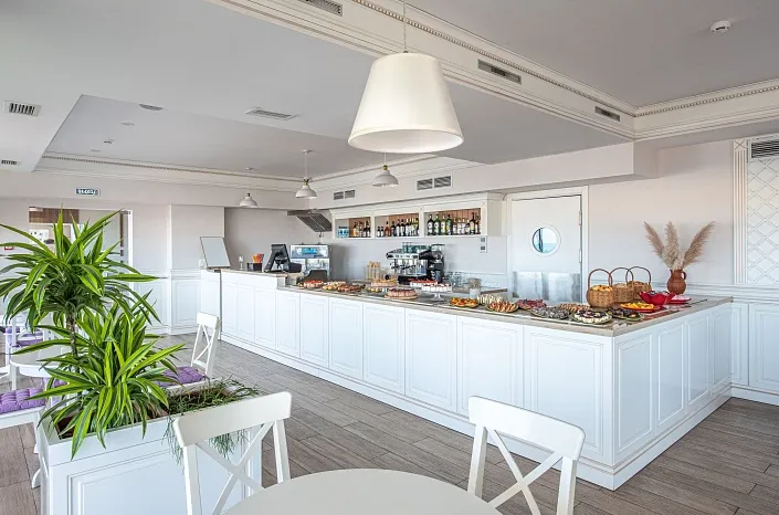 Территория отеля — настоящий оазис, расположенный на первой береговой линии. Постояльцы ощутят всю прелесть освещающего отдыха в тени южных растений и жаркого — на берегу Черного моря.